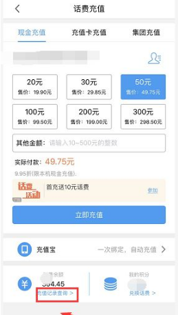 进入充值界面,点击下面余额后面的充值记录查询蓝色字体链接,如下图所示